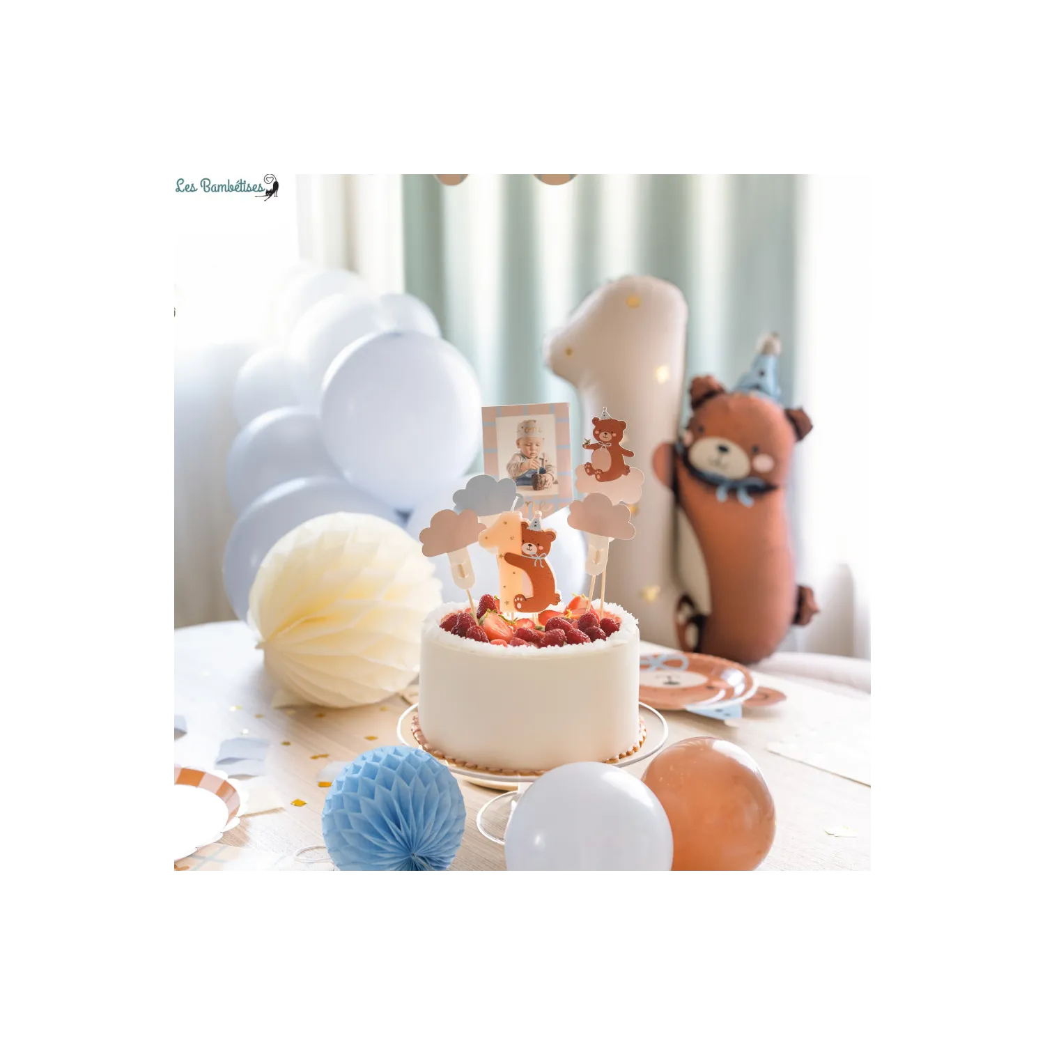 Un adorable ourson beige, portant un petit chapeau bleu ciel, s'agrippe avec tendresse au chiffre, ajoutant une touche enfantine et joyeuse à la fête.