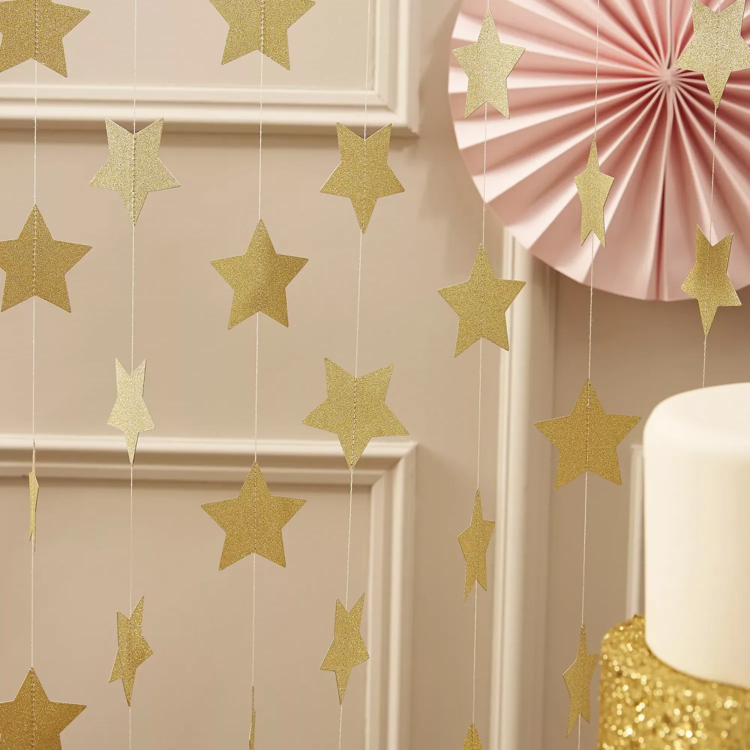 Composée d’étoiles en carton doré scintillant, reliées entre elles par un fil blanc discret, cette guirlande est parfaite pour illuminer toutes vos décorations, du plafond aux murs, en passant par les buffets ou les arches de fête.